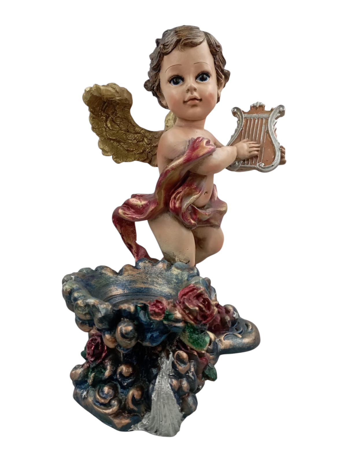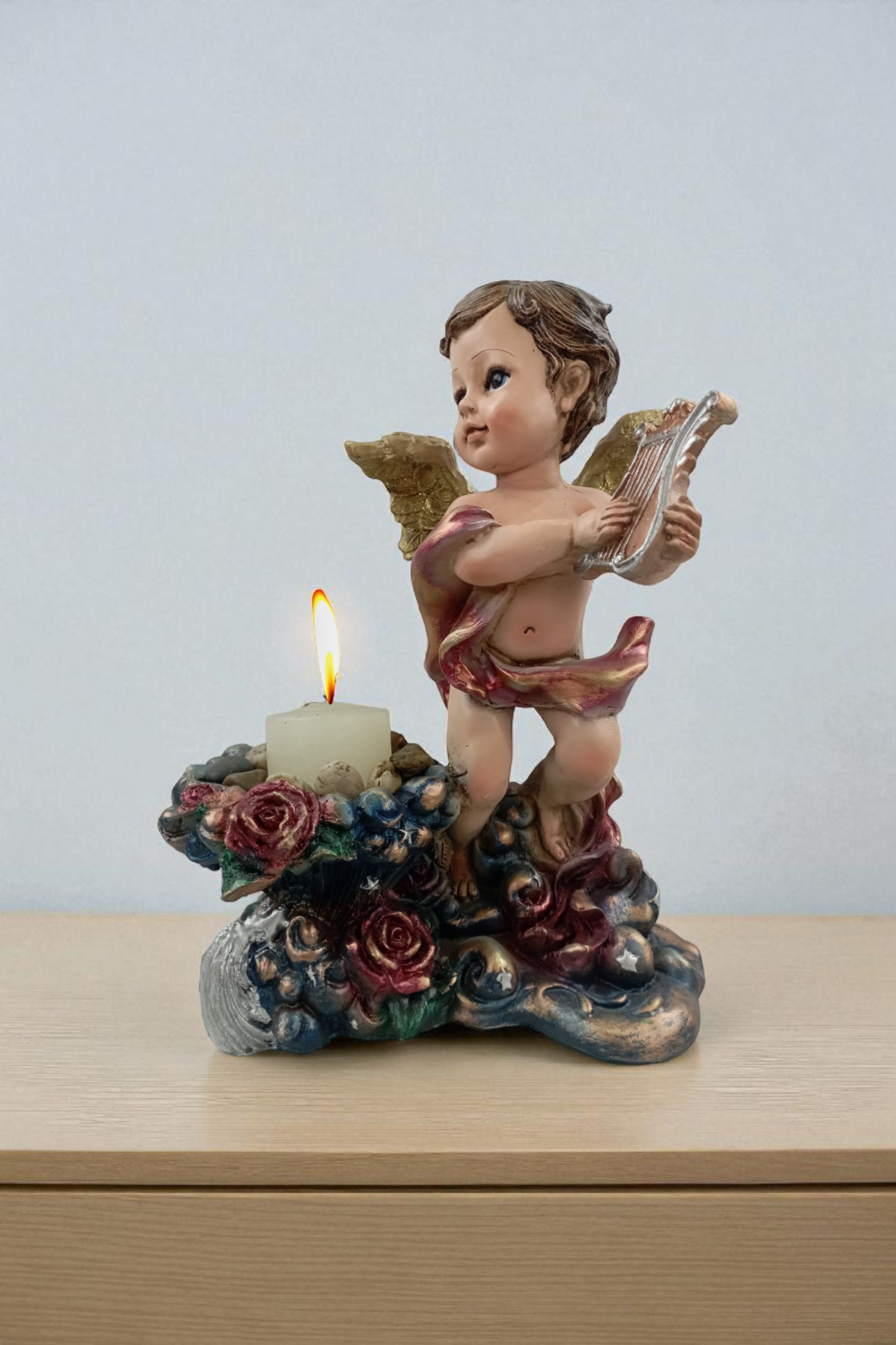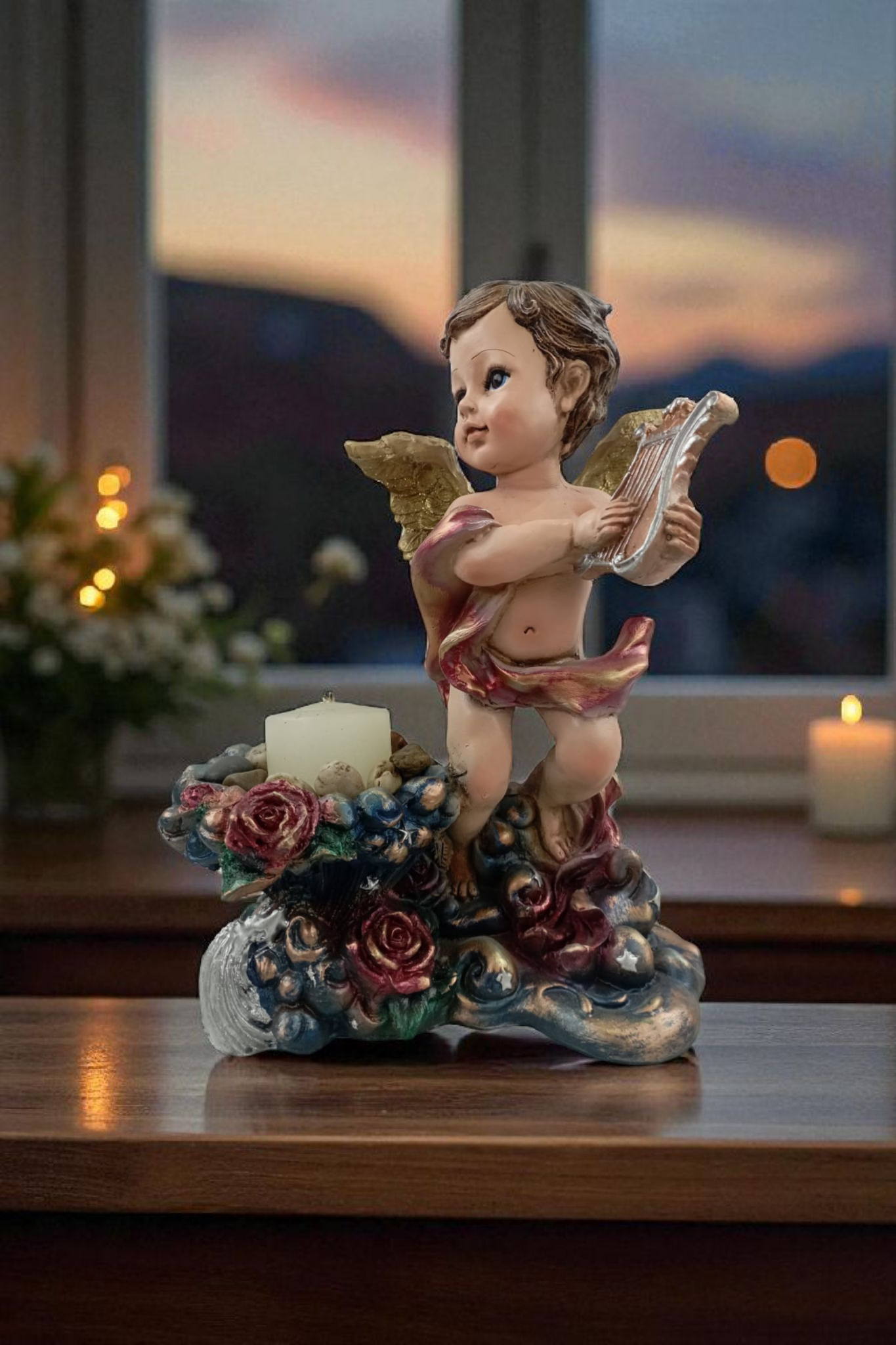 Hermoso ángel de resina finamente detallado, con alas doradas y un delicado acabado en tonos suaves. Sostiene una lira, símbolo de paz y armonía, mientras se acompaña de un portavelas integrado en la base adornada con flores y detalles artísticos.
