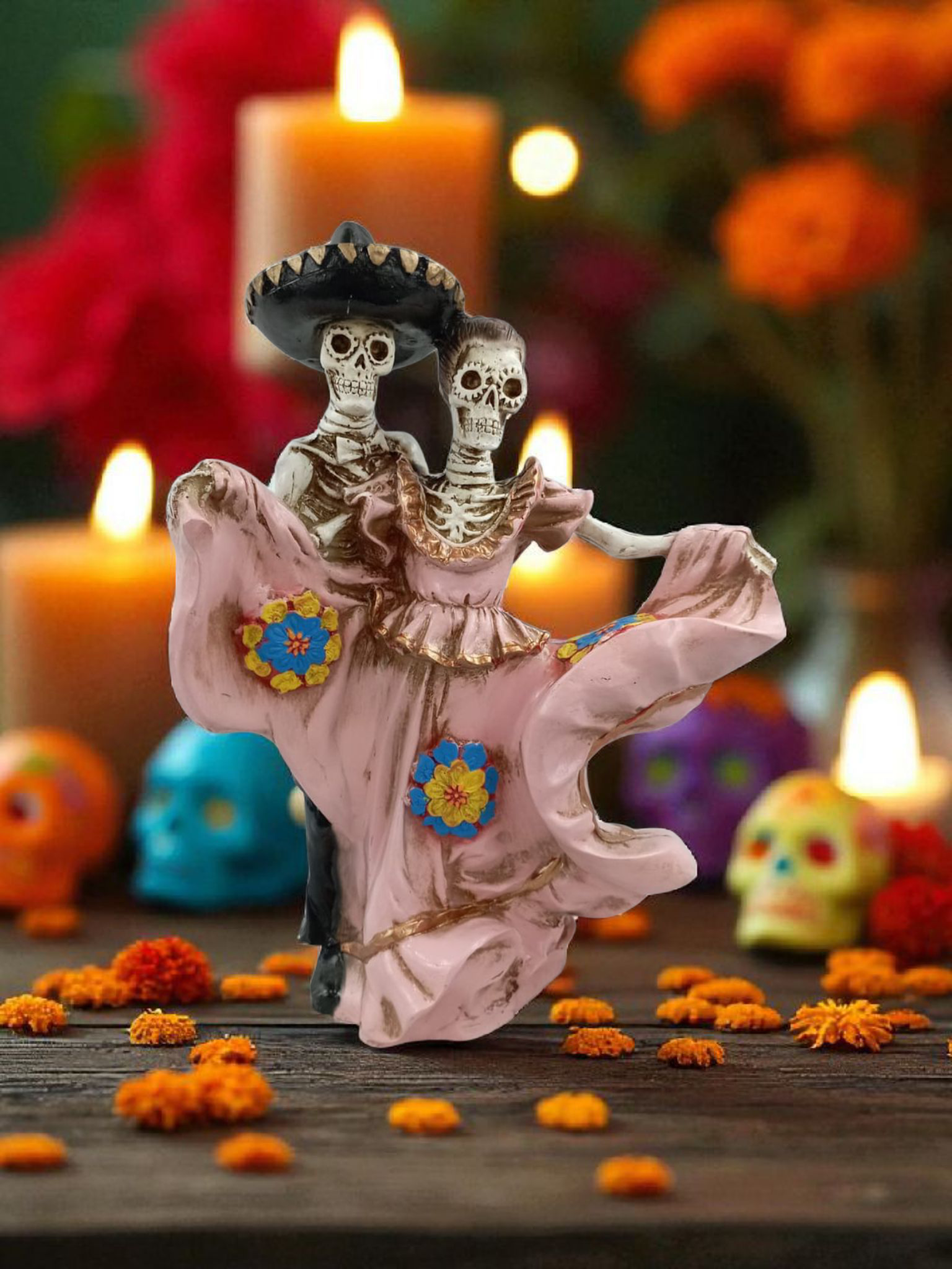 Hecha en México, esta figura celebra el arte popular y la belleza de nuestras costumbres, recordándonos que en cada danza y en cada recuerdo, la muerte también puede ser motivo de fiesta y cariño.