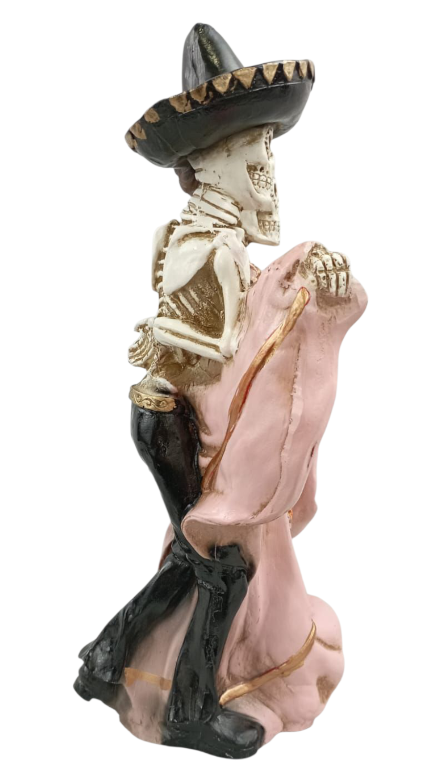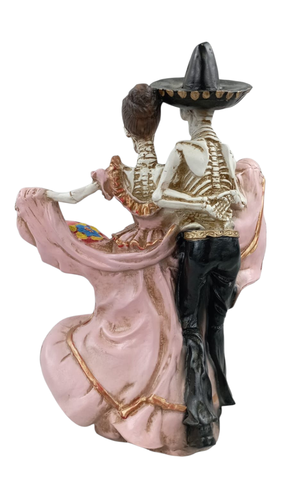 Esta hermosa pareja de catrines de 30 cm, elaborada con resina y pintada a mano, representa la alegría y el color del folclore mexicano. Con delicados detalles, la figura muestra a una catrina vestida con un tradicional traje de baile regional, en tonos rosados y decorada con flores de colores vibrantes, mientras su compañero, el catrín con sombrero charro, la acompaña en un elegante y eterno baile.
