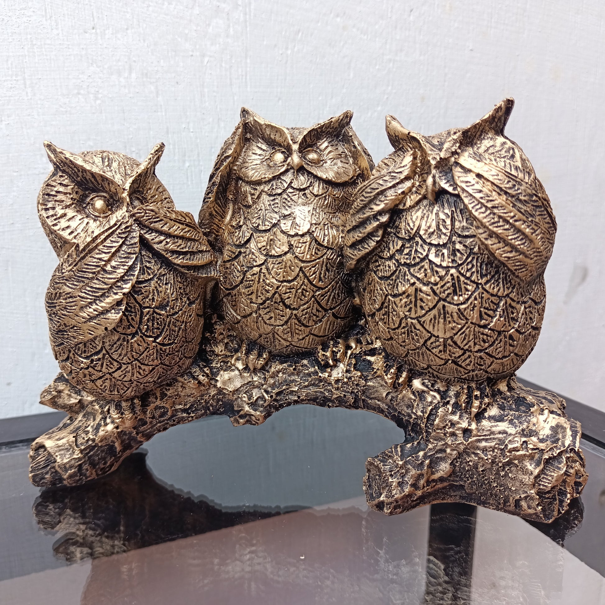 Agrega un toque de sabiduría ancestral a tu hogar con esta magnífica estatua decorativa de tres búhos.