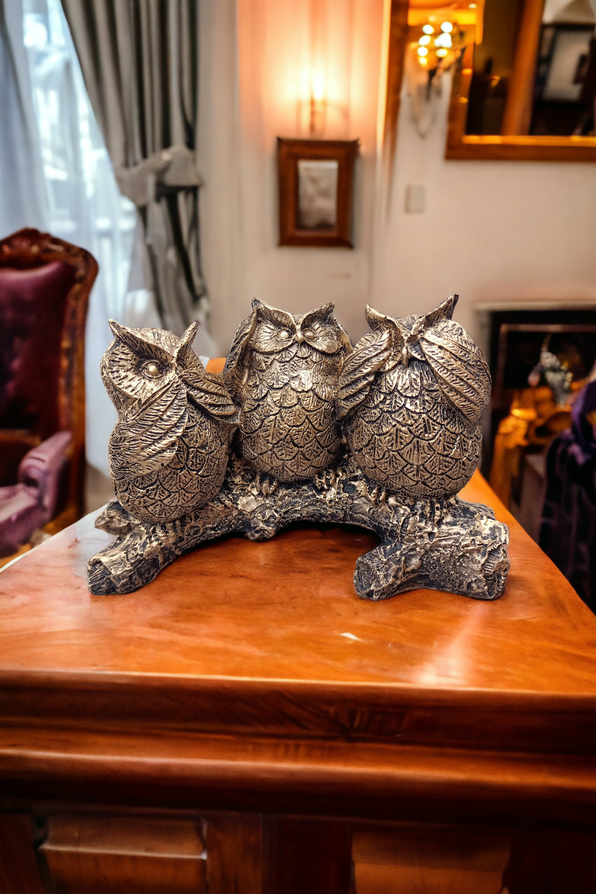 - Cada búho ha sido esculpido con una personalidad única, desde sus expresivos ojos hasta sus poses características, creando una composición armoniosa que cautivará a todos los amantes de la decoración con temática natural y simbólica.