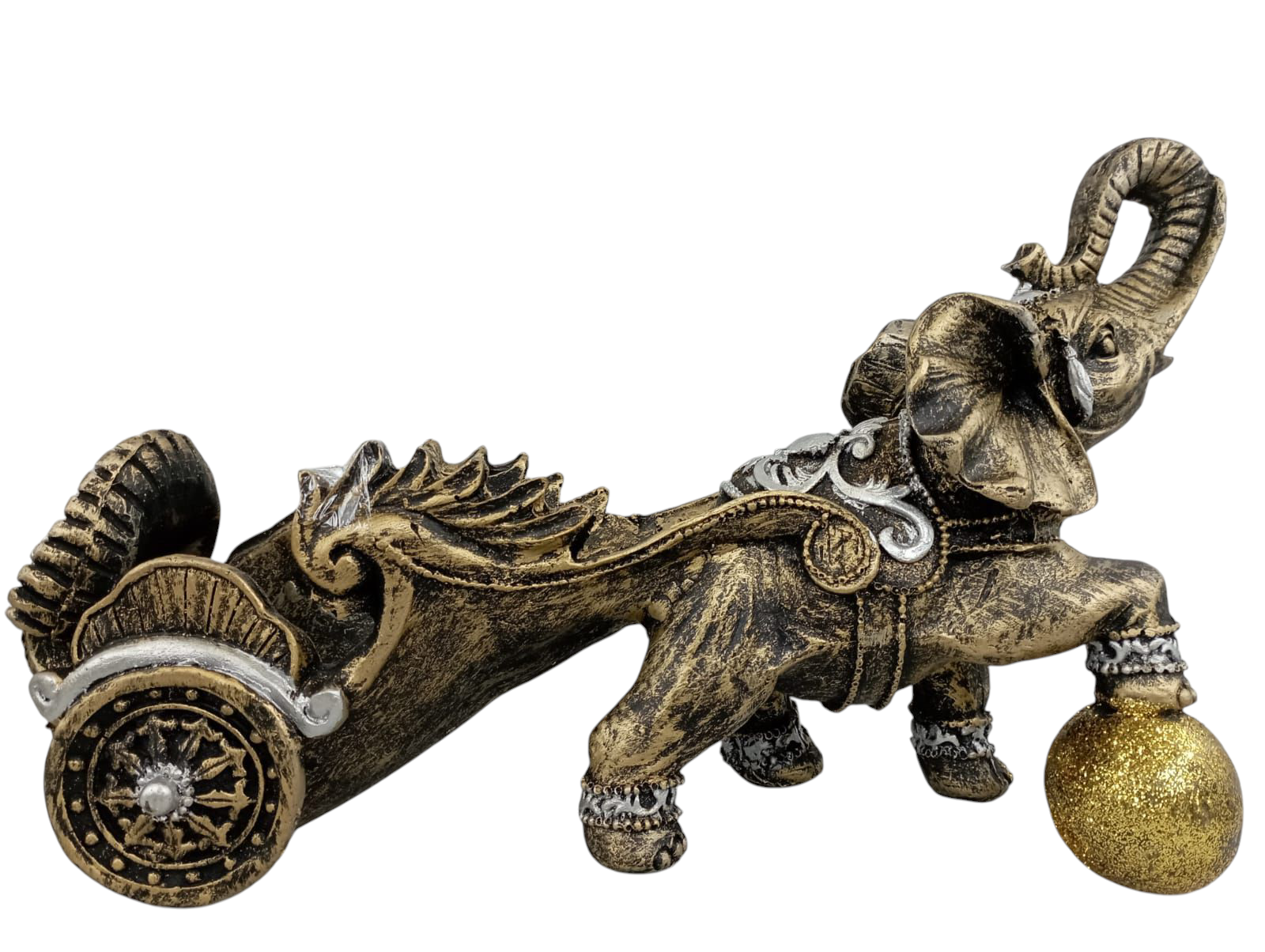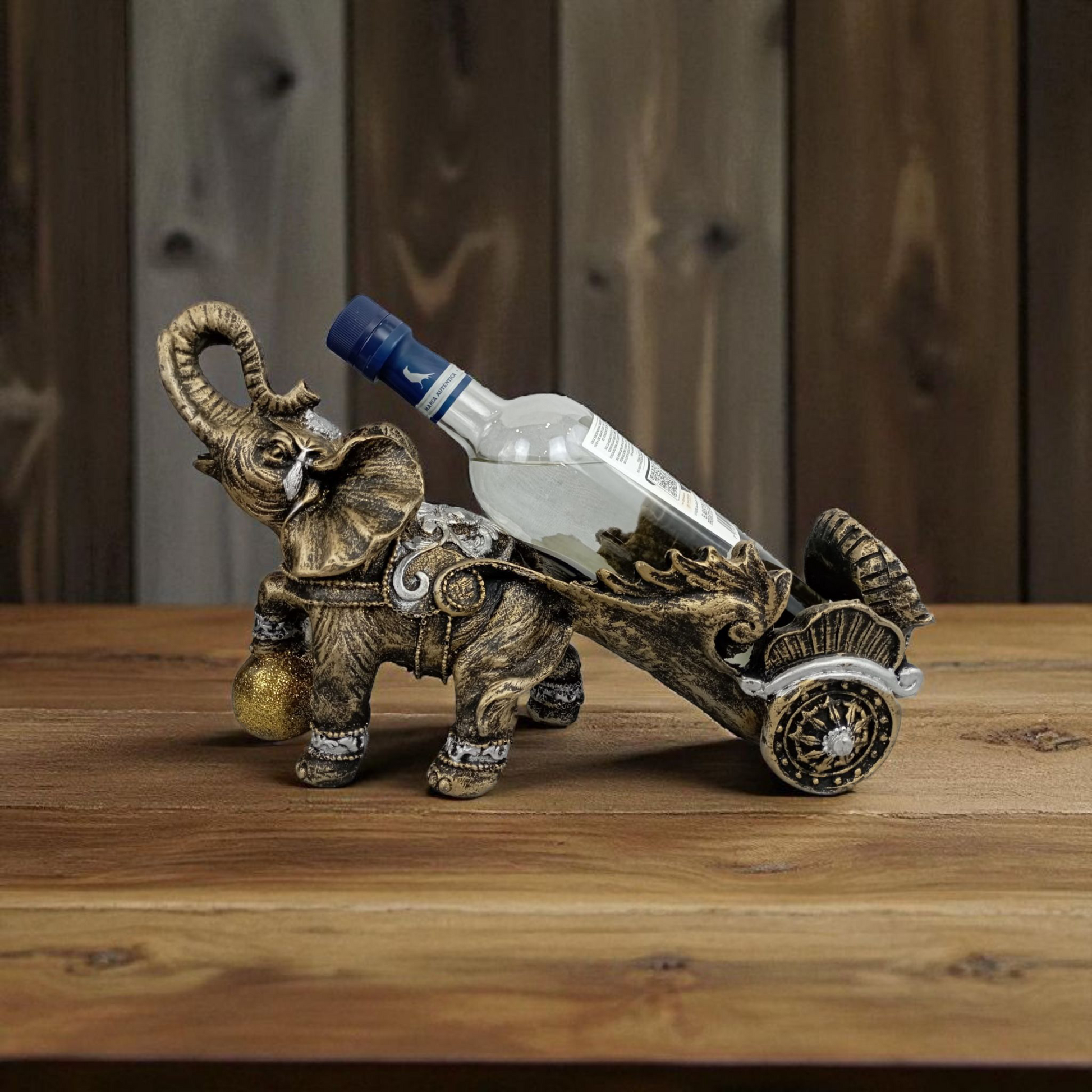Elefante porta botella de resina, con diseño detallado y acabados pintados a mano. Sostiene una botella sobre su trompa en posición inclinada, ideal para exhibir botellas de vino, tequila, ron o cualquier bebida especial.