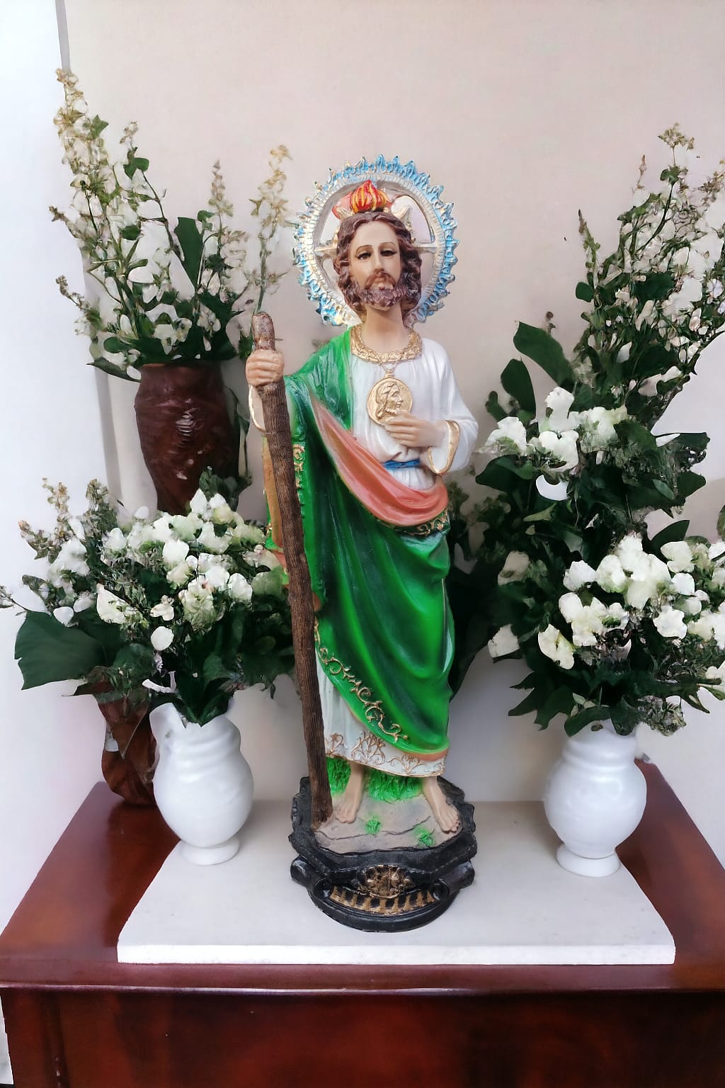 Imponente figura de San Judas Tadeo elaborada en resina de alta calidad y pintada a mano con detalles realistas. Mide 50 cm de alto, ideal para colocar en altares, capillas, negocios o espacios de oración. Viste túnica verde con detalles dorados y porta su medalla con el rostro de Cristo en el pecho, símbolo de su fe y poder intercesor.