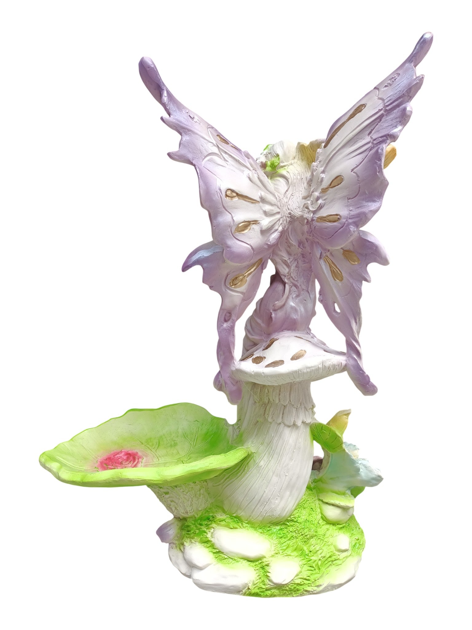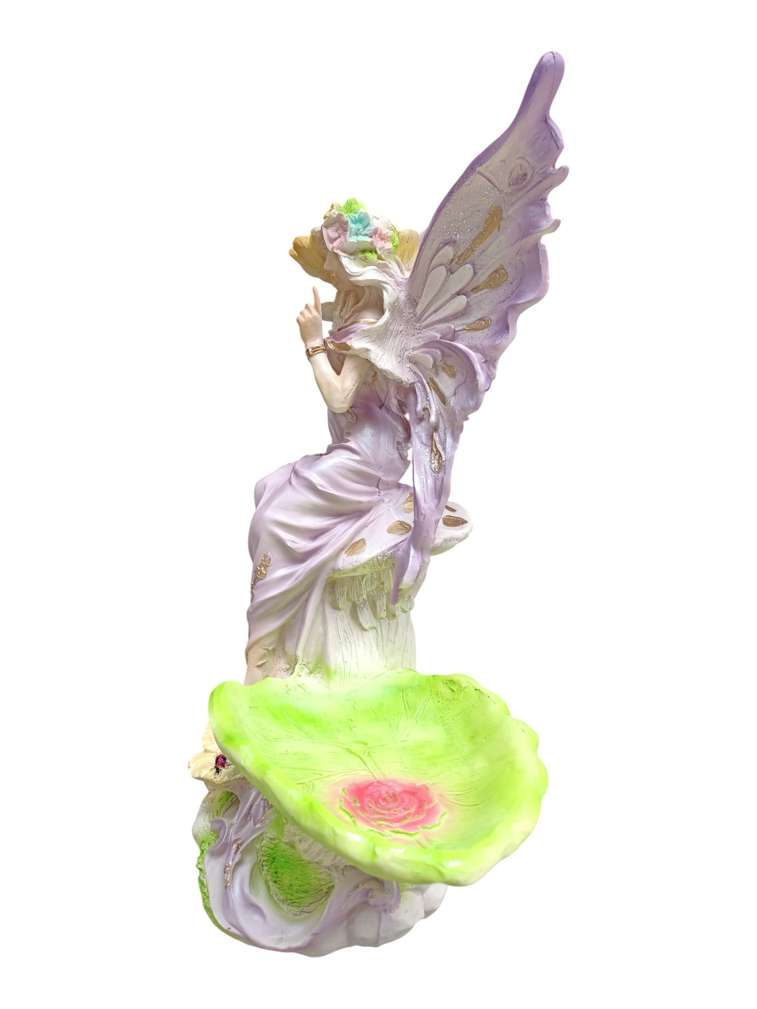 El Centro de mesa en forma de hada es una pieza encantadora que combina elegancia, fantasía y arte en una sola creación. Elaborada en resina de alta calidad, esta figura representa a un hada etérea de expresión serena, vestida con un delicado manto color lila que resalta su belleza mágica y los finos detalles dorados que adornan su atuendo.