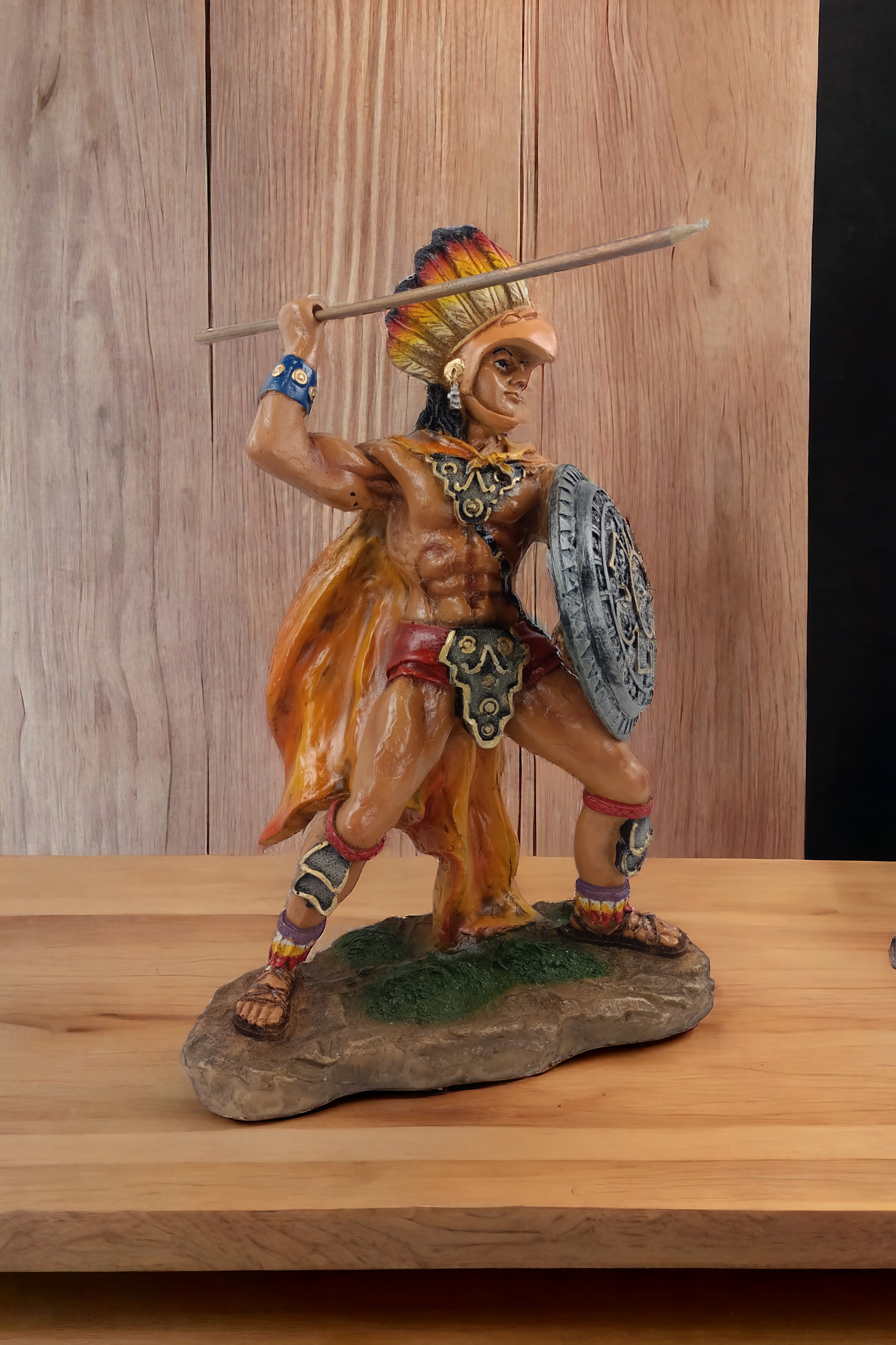 Descubre la belleza y cultura de los guerreros aztecas con esta figura decorativa en resina. Con su escudo y calendario azteca, representa la fuerza y sabiduría del pueblo indígena. Ideal para dar un toque étnico a tu hogar o para regalar a los amantes de la historia y la artesanía.