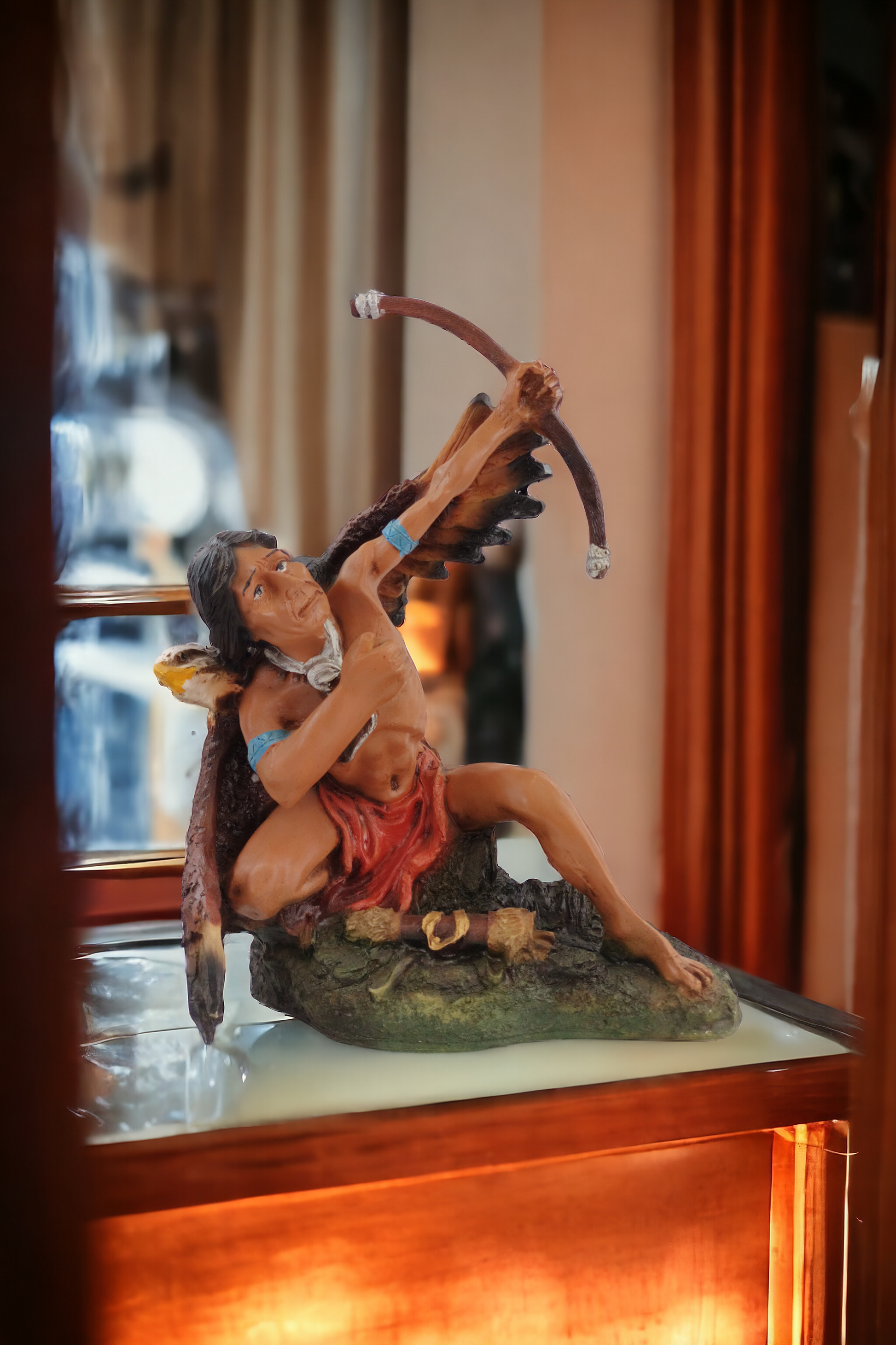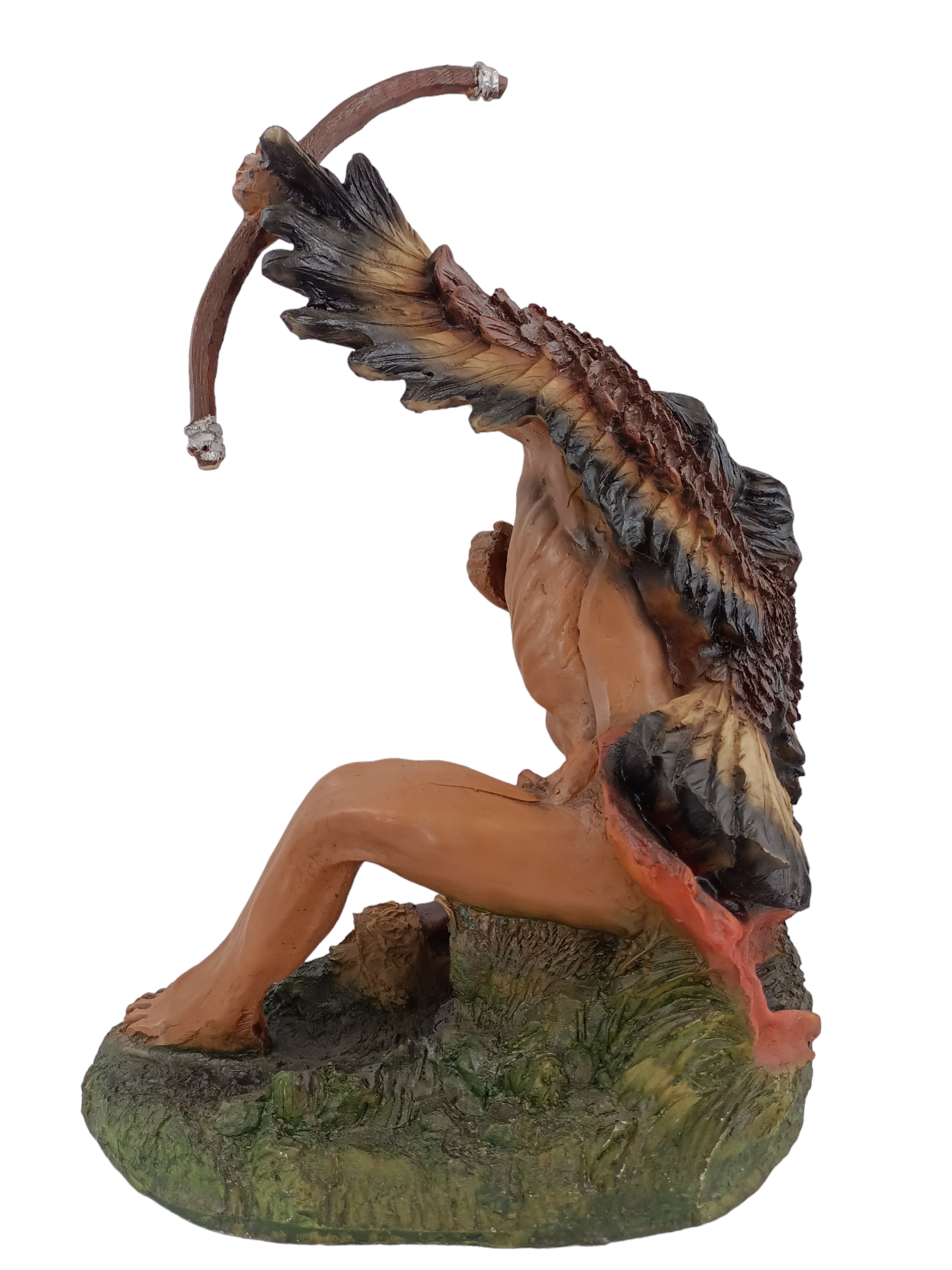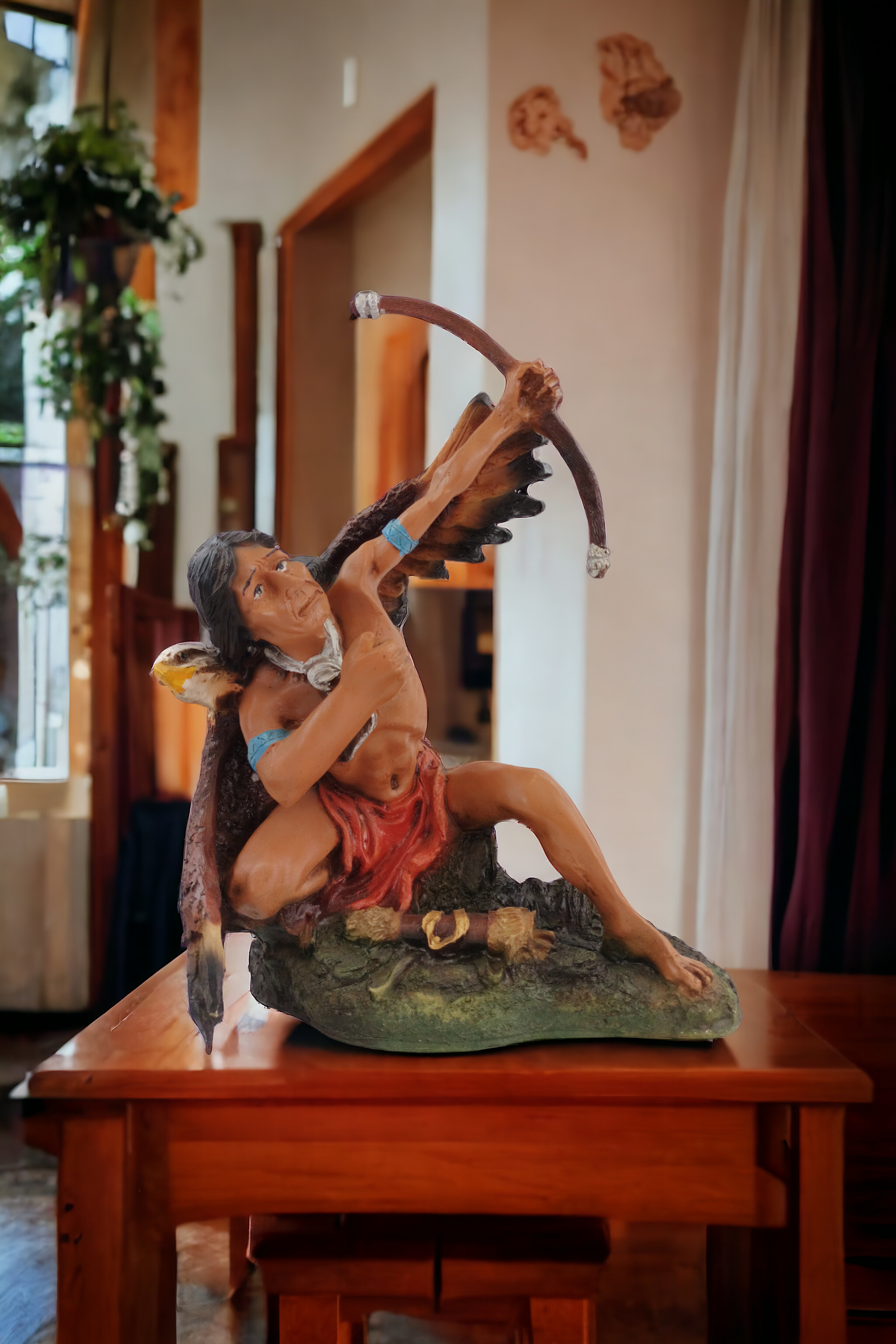 Esta impresionante escultura de resina representa un indio nativo americano cazador que simboliza protección y valentía. La figura, hecha con detalles y realismo excepcionales, mide 43 cm y es una adición perfecta a cualquier decoración del hogar.