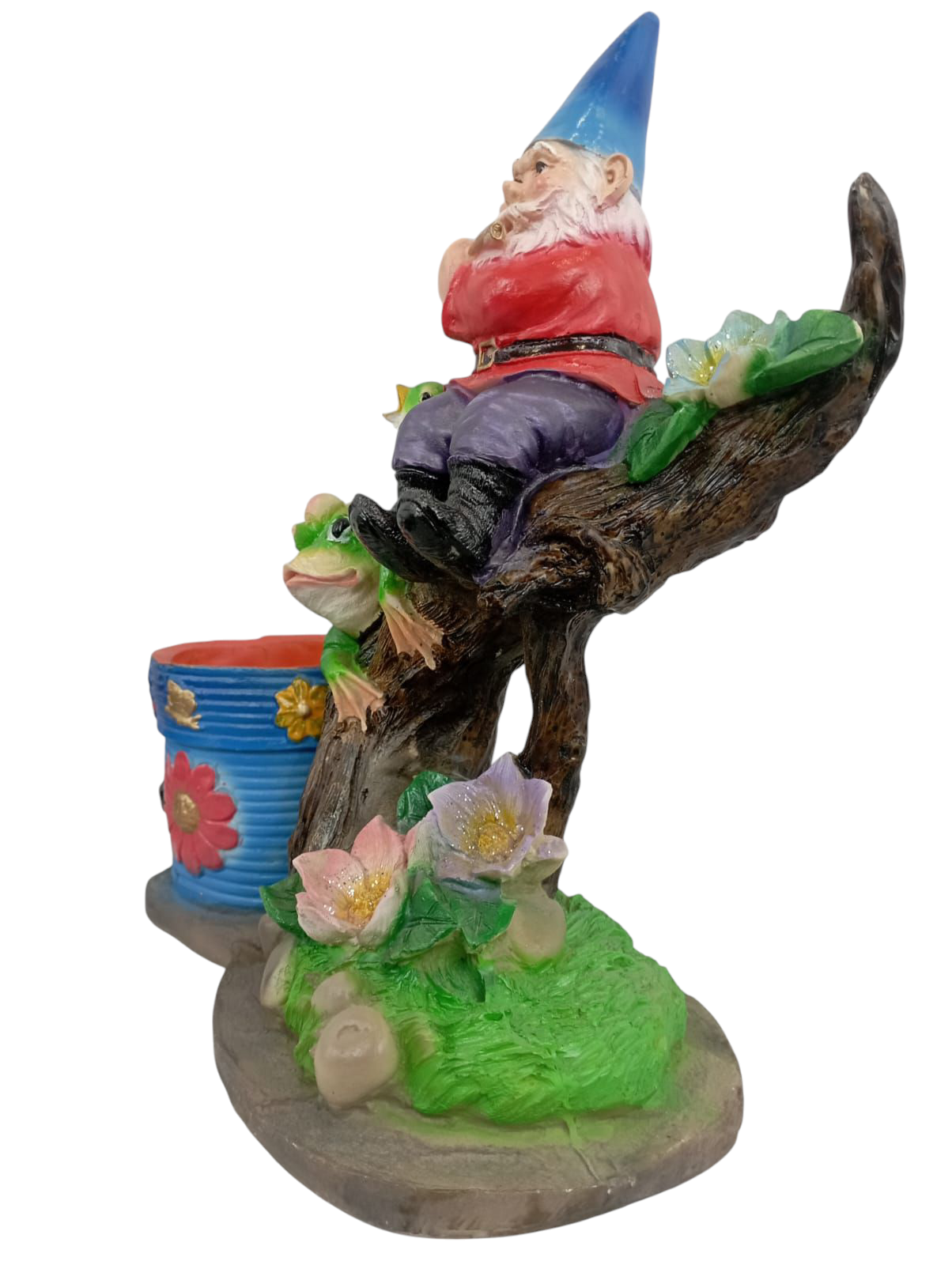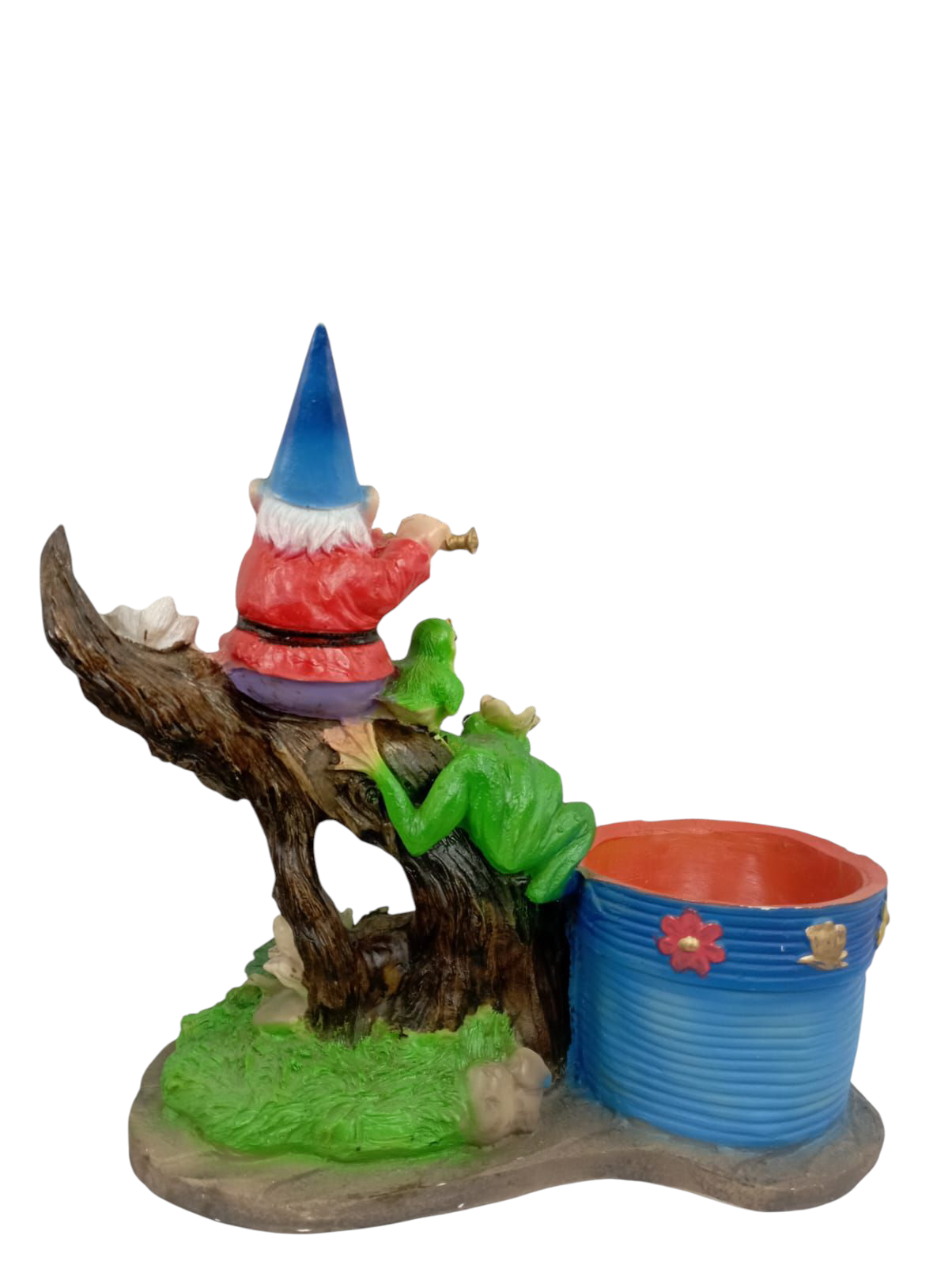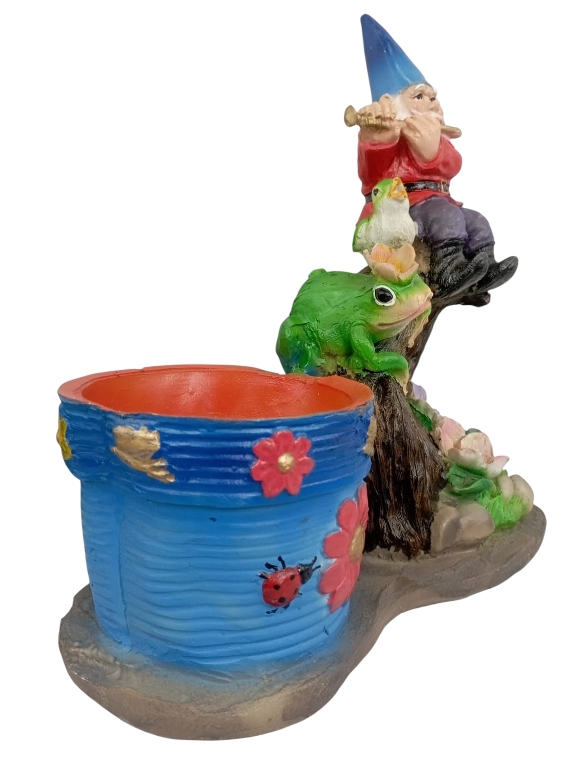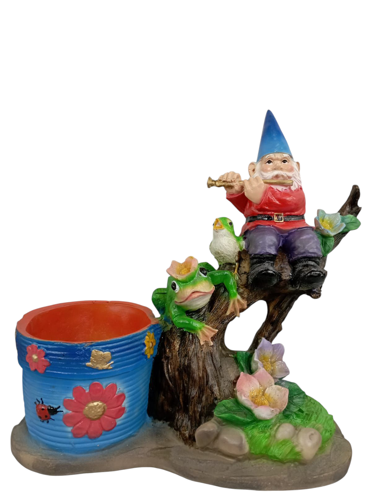 Agrega un toque de magia y alegría a tu espacio con esta figura artesanal de un duende músico tocando su flauta, rodeado de una rana con sombrero, un pajarito y flores. La maceta decorativa incluida es ideal para suculentas o cactus.