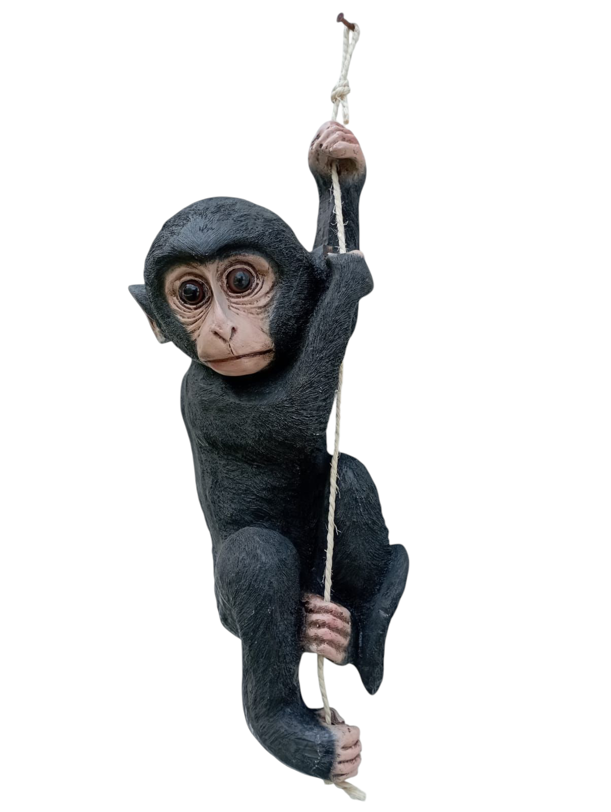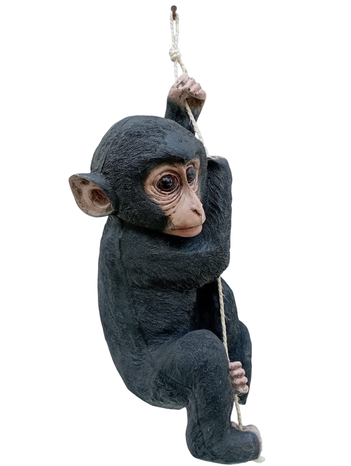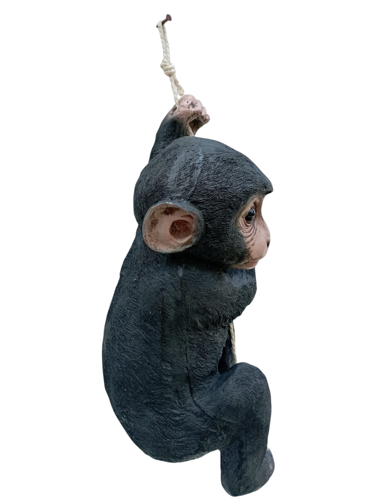 Figura de mono colgante de resina, divertida y original, perfecta para decorar paredes, terrazas, jardines o espacios interiores. Este mono está colgado de un lazo, simulando movimiento y dinamismo, lo que aporta un toque único y simpático a cualquier ambiente.