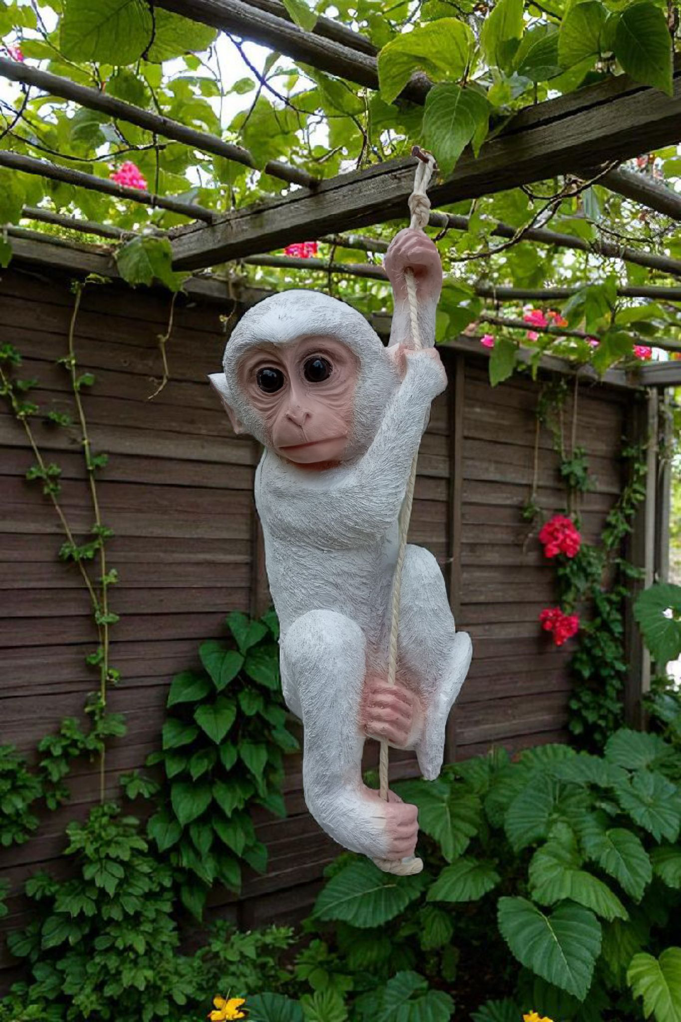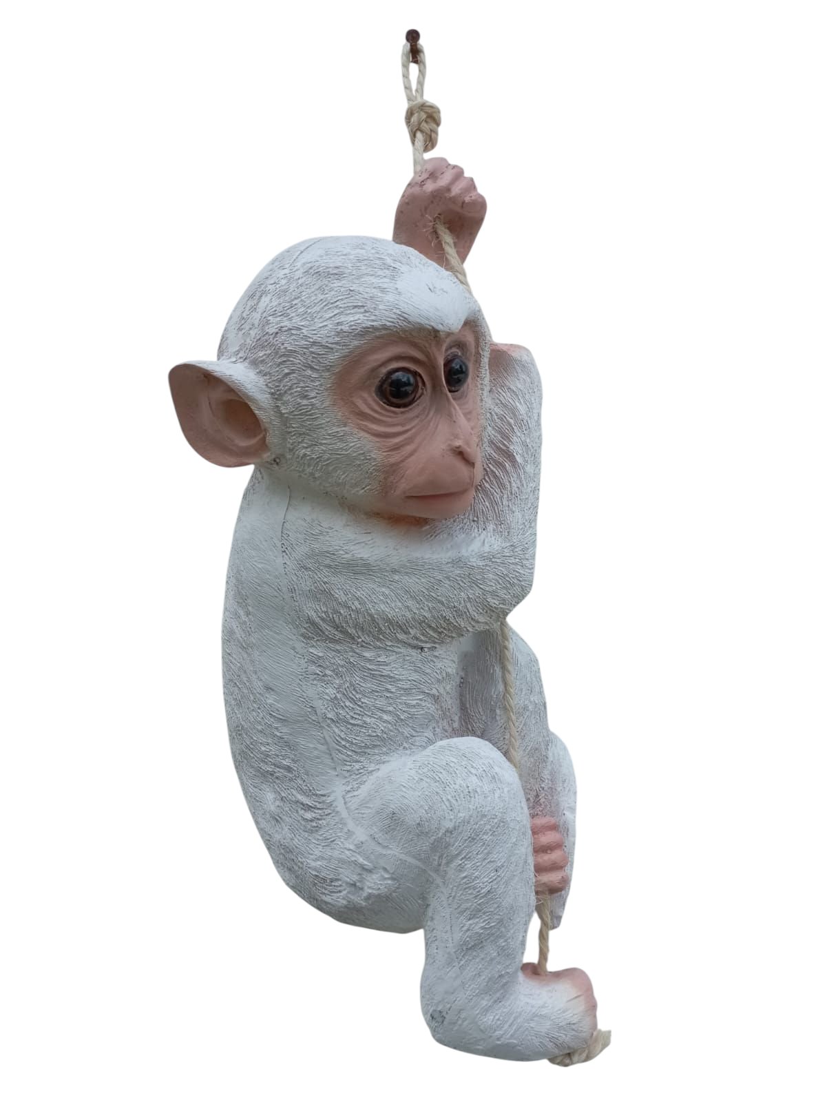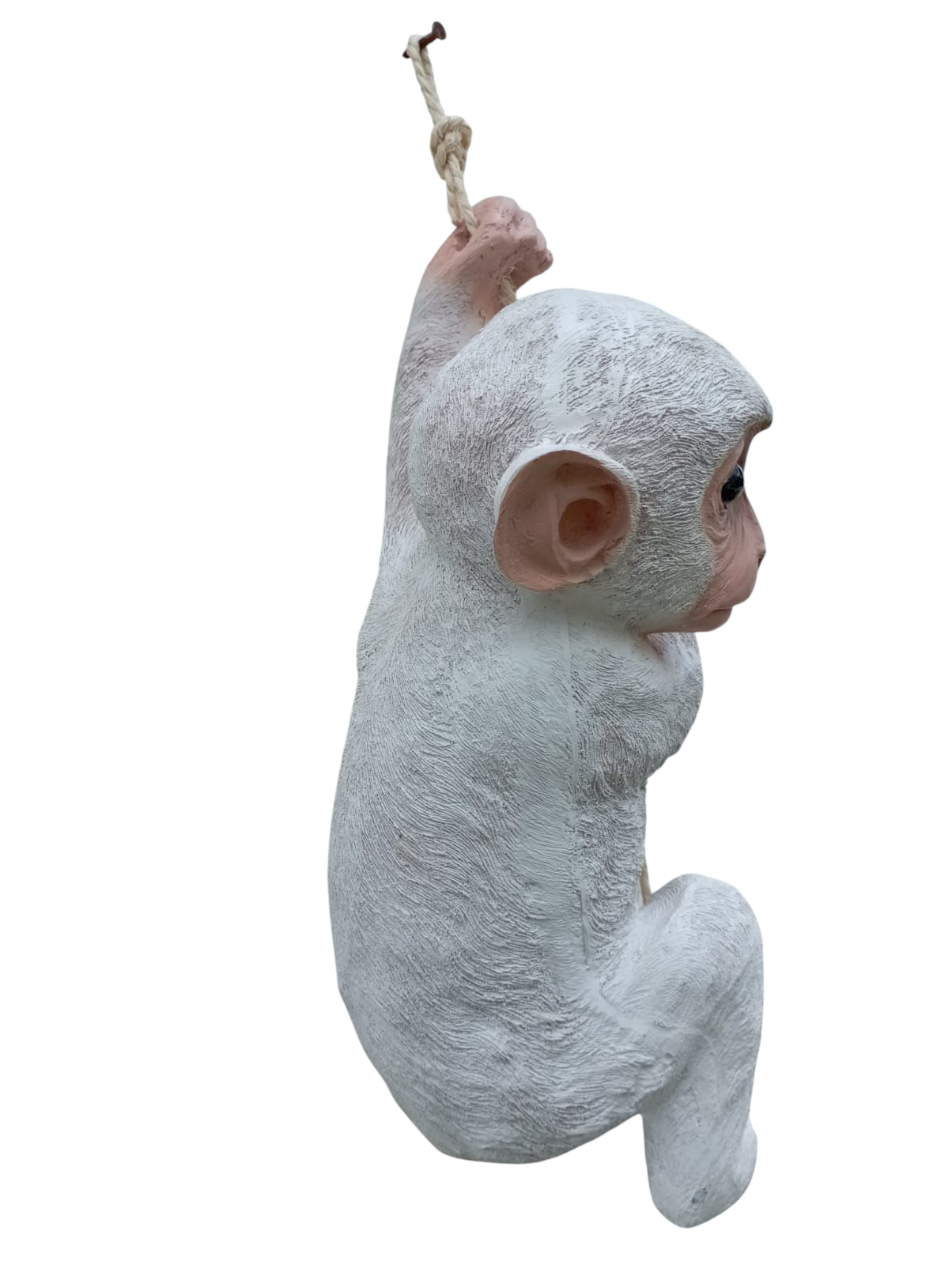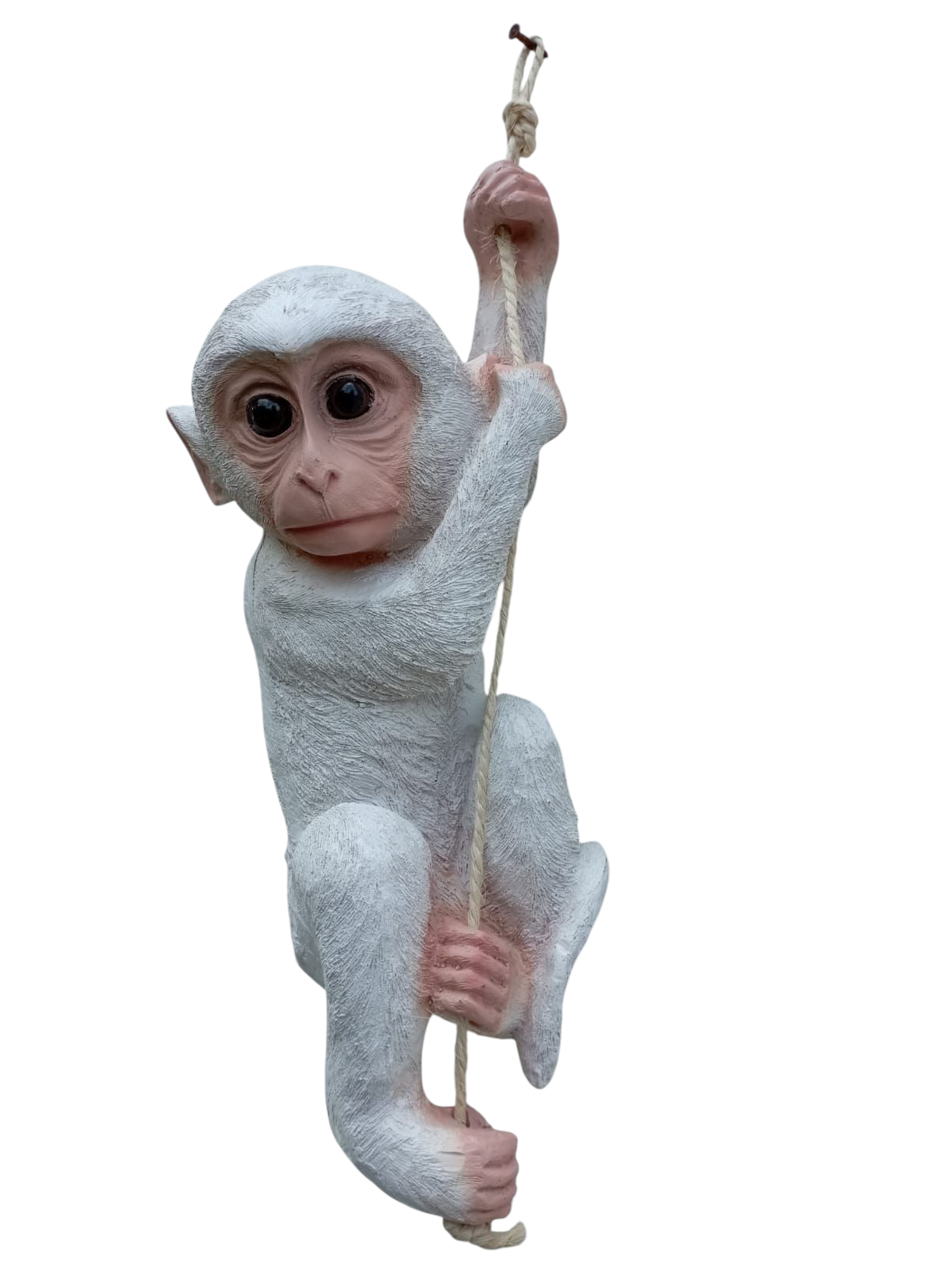 Figura de mono colgante de resina, divertida y original, perfecta para decorar paredes, terrazas, jardines o espacios interiores. Este mono está colgado de un lazo, simulando movimiento y dinamismo, lo que aporta un toque único y simpático a cualquier ambiente.