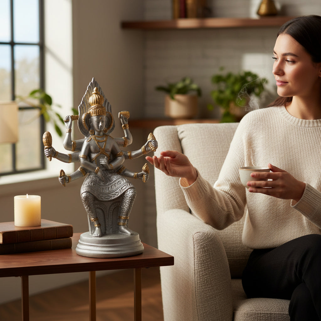 Figura decorativa de la diosa Kali elaborada en resina, con un acabado en tonos plateado y dorado que resalta los detalles de su iconografía. La escultura presenta a la deidad con múltiples brazos, ricamente ornamentada con corona, joyería y relieves finamente trabajados, transmitiendo fuerza, protección y poder espiritual.