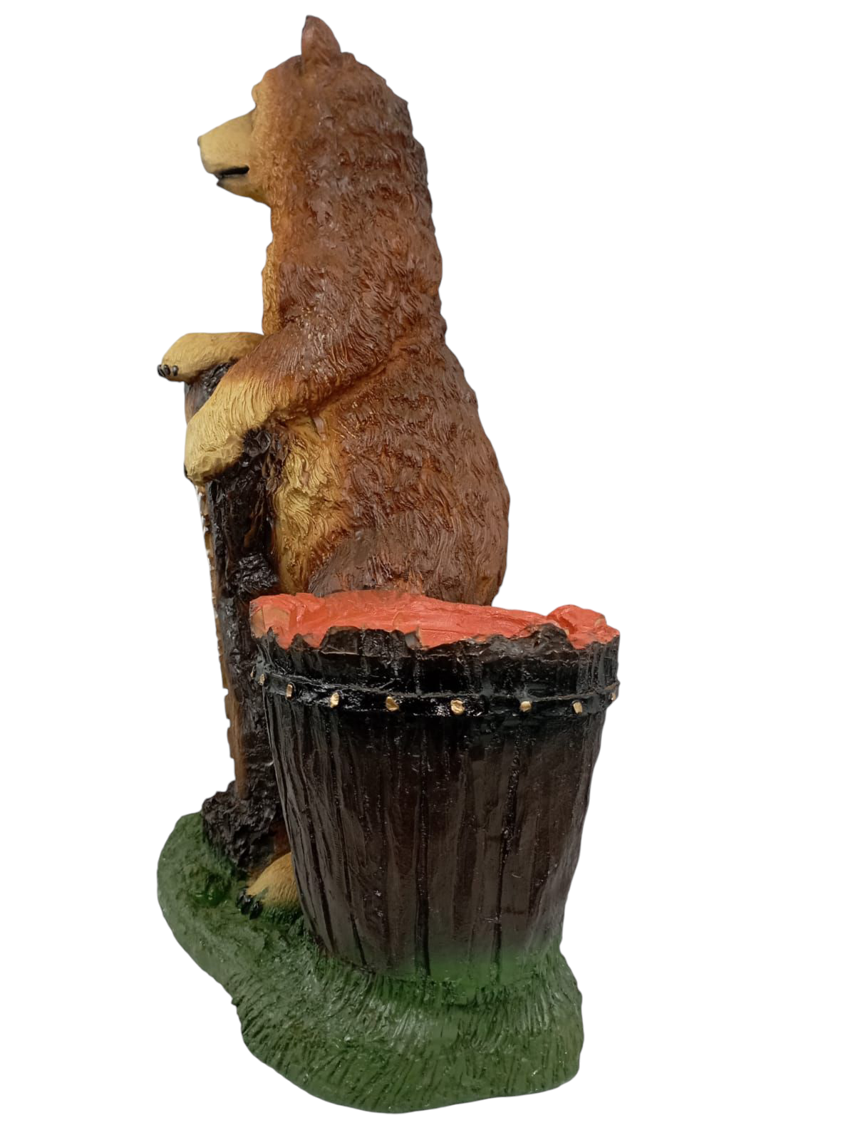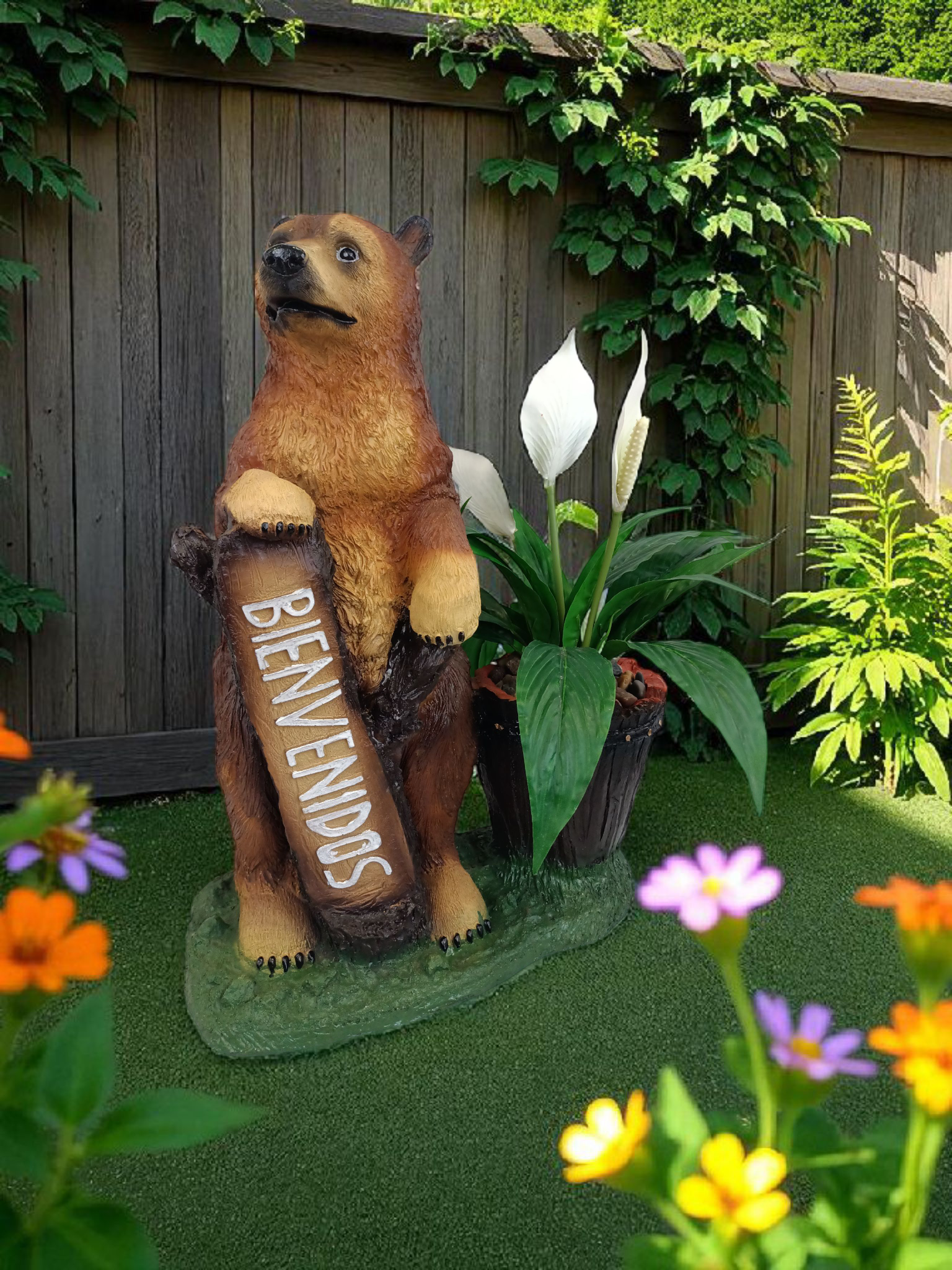 Figura de oso con cartel “Bienvenidos” y maceta integrada, ideal para decorar jardines, entradas, patios o terrazas. Este oso amigable da la bienvenida con su letrero mientras sostiene una maceta perfecta para plantas pequeñas, flores o suculentas, aportando frescura y calidez a tu espacio exterior.
