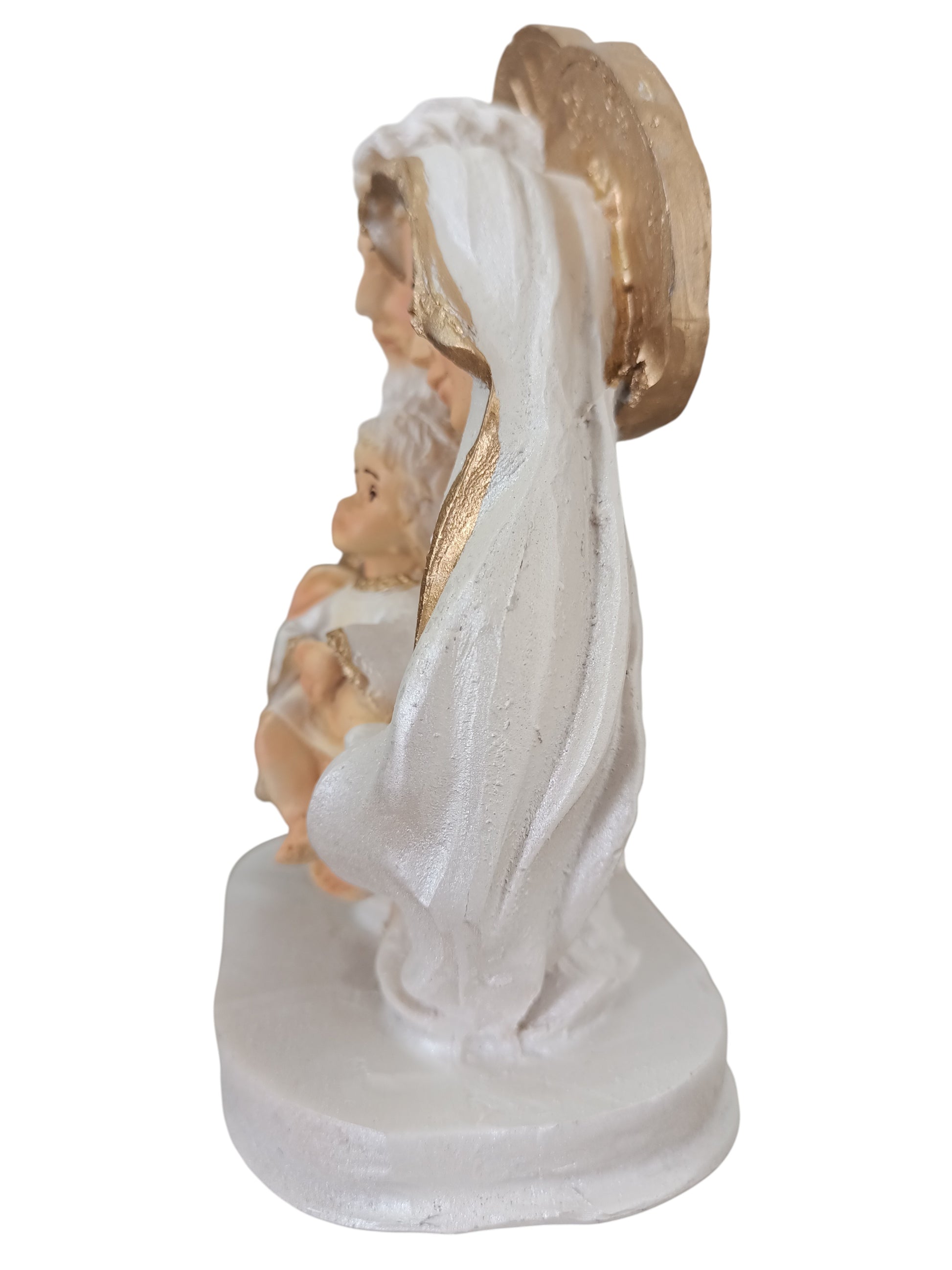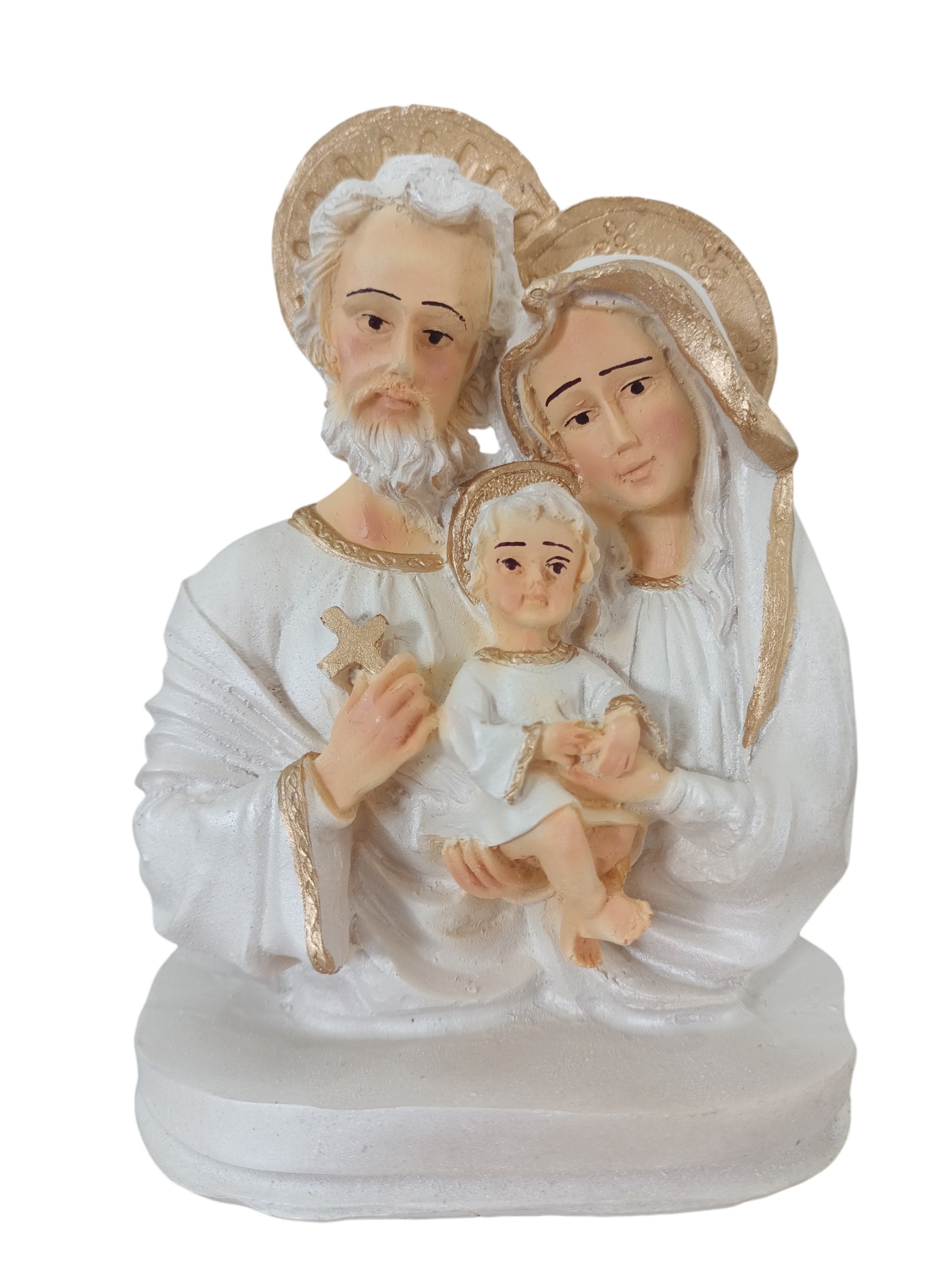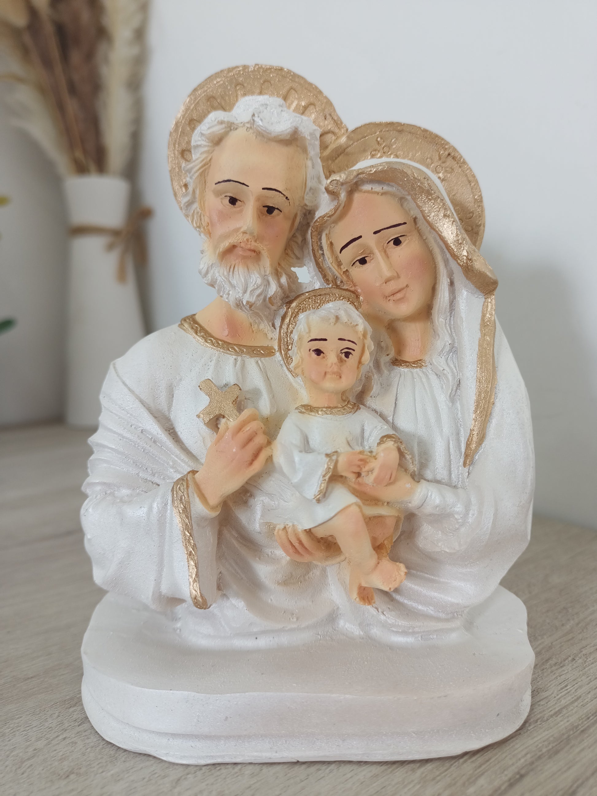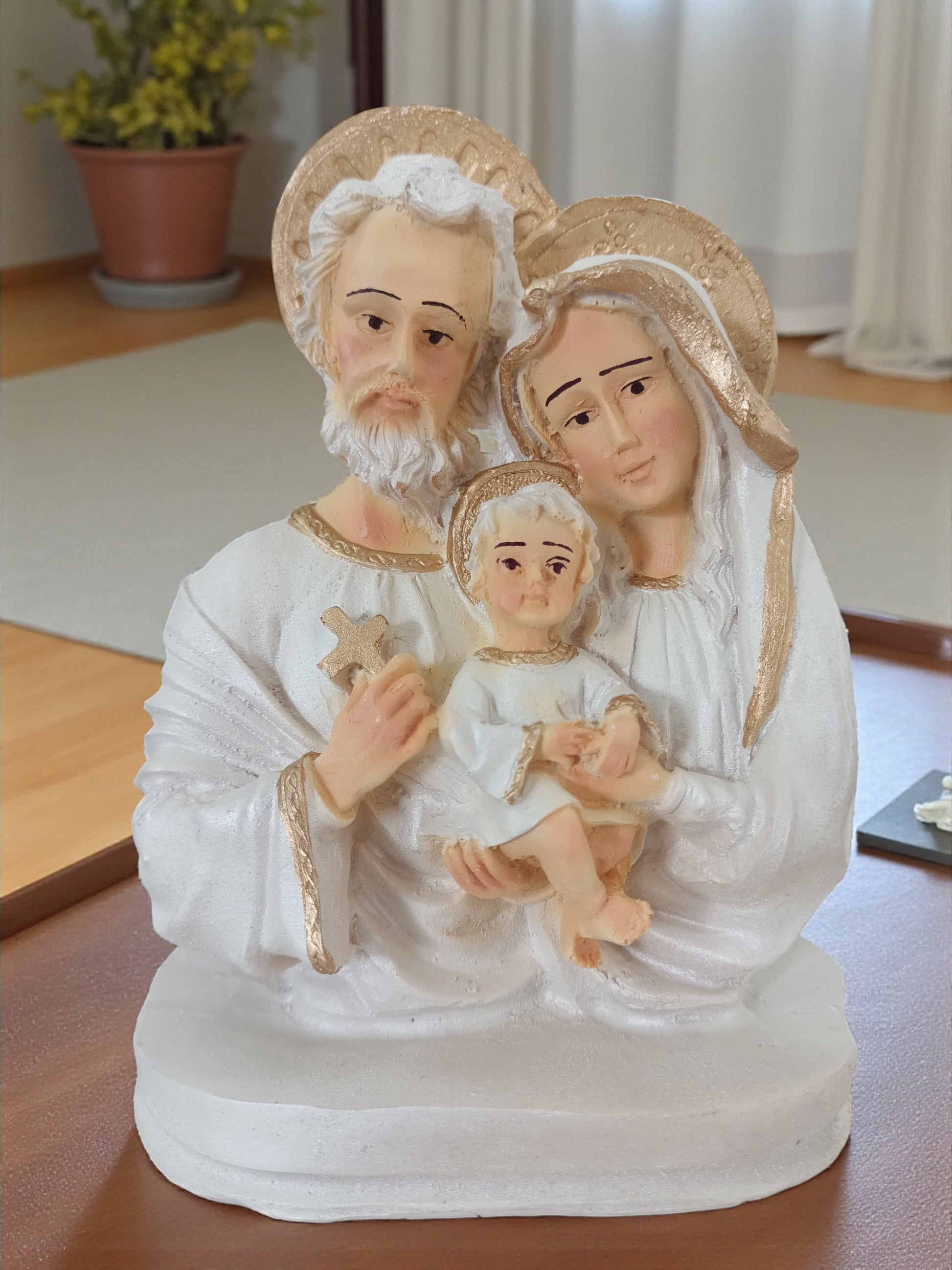 Cada pieza ha sido cuidadosamente elaborada en resina artesanal, con finos detalles que reflejan ternura, devoción y armonía familiar. Su tamaño compacto la hace perfecta como souvenir o recuerdo de mesa, fácil de colocar en cualquier espacio del hogar o altar.
